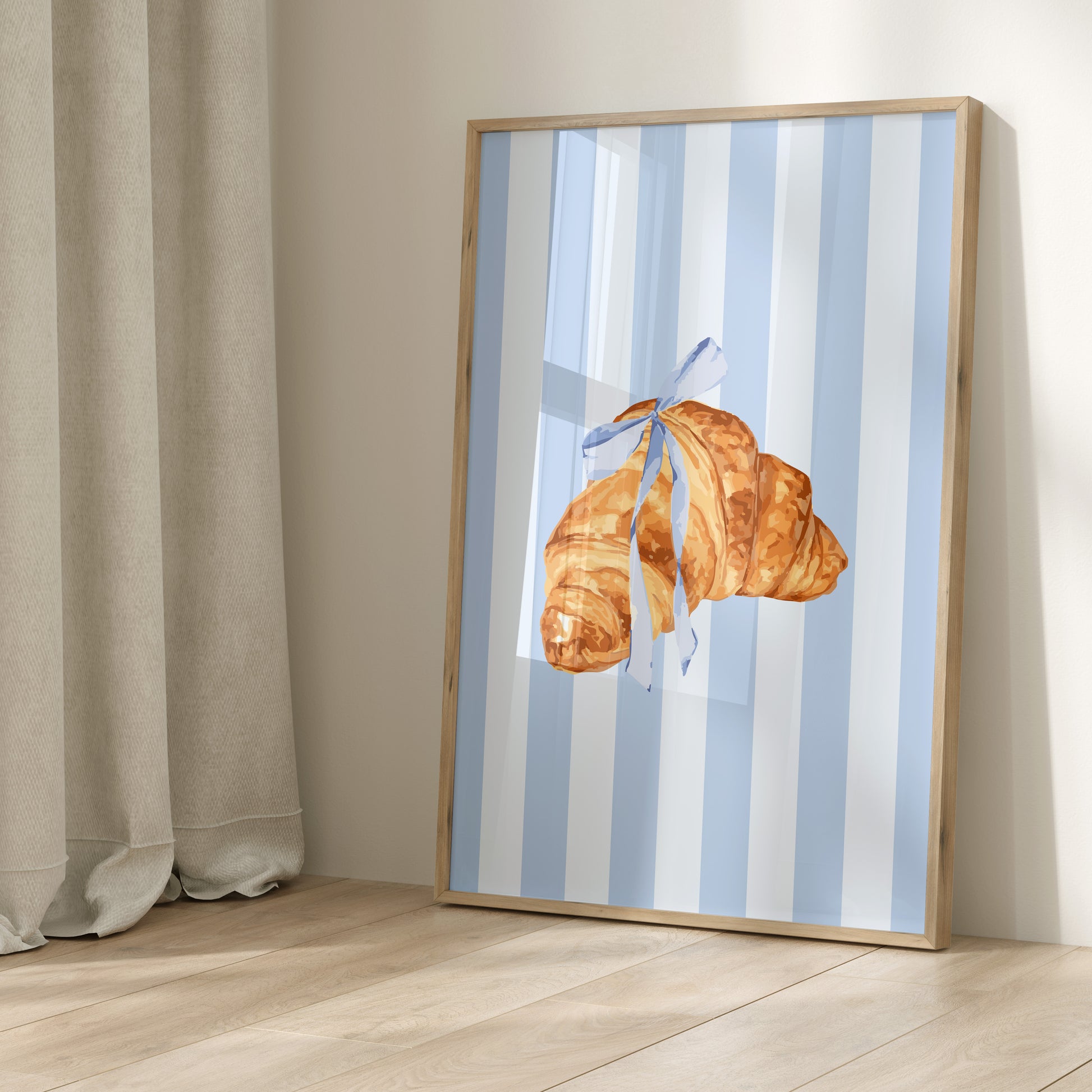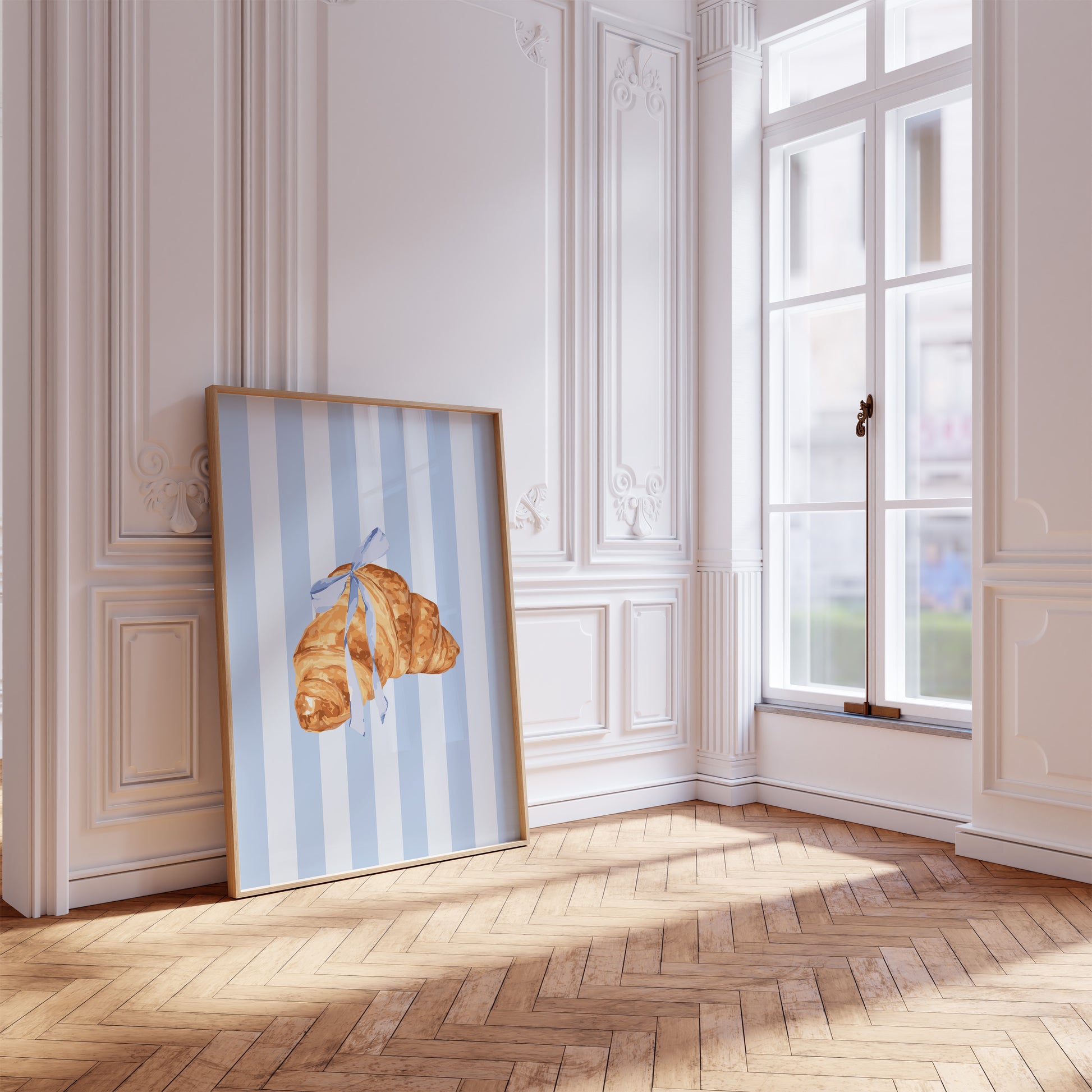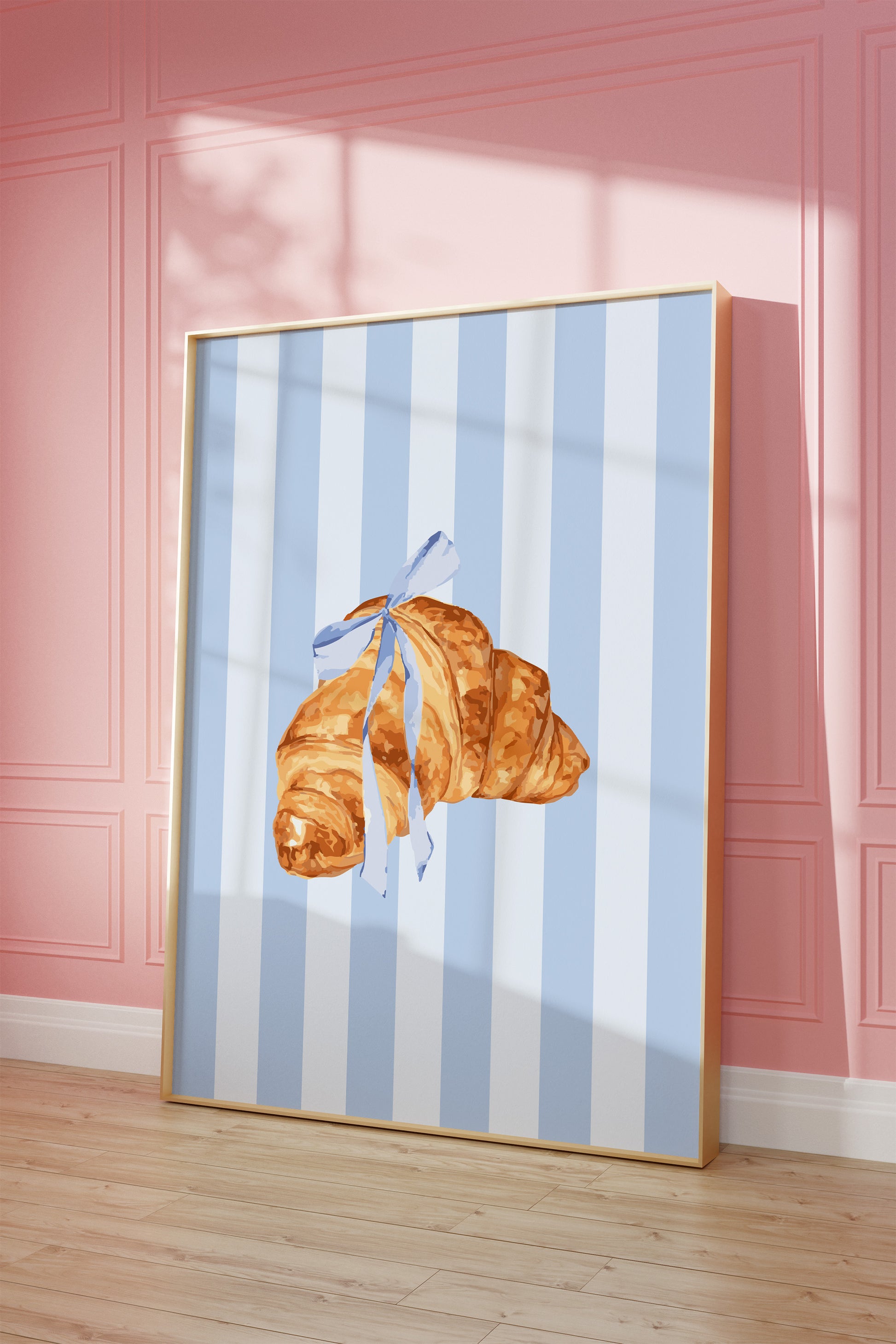 Bring a touch of Parisian charm to your space with this French Croissant Digital Wall Art. Featuring a croissant tied with a soft blue ribbon against a pastel blue striped background, this print combines whimsy with elegance—perfect for kitchen decor, café space decor, bakery decor, or cozy breakfast nook decor.