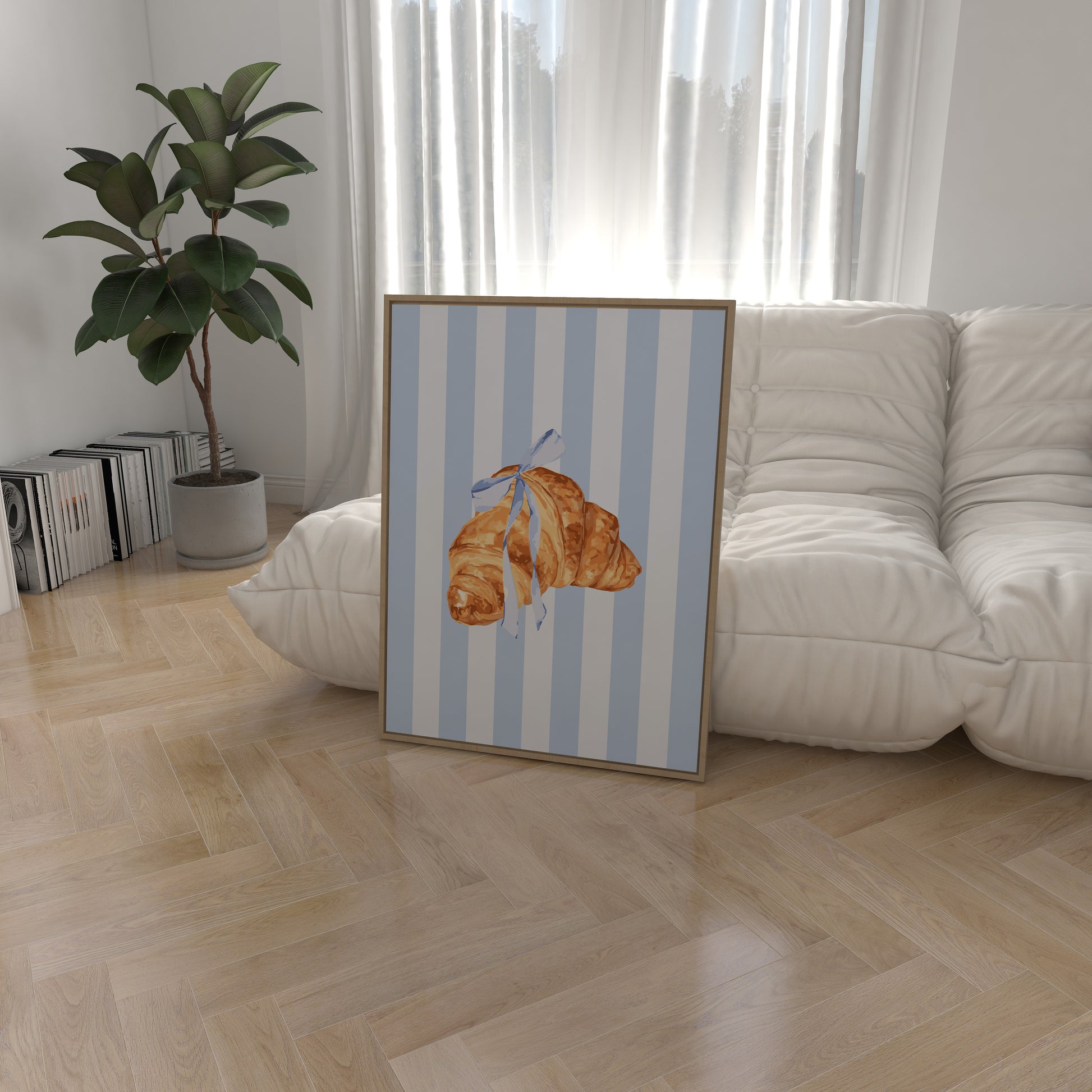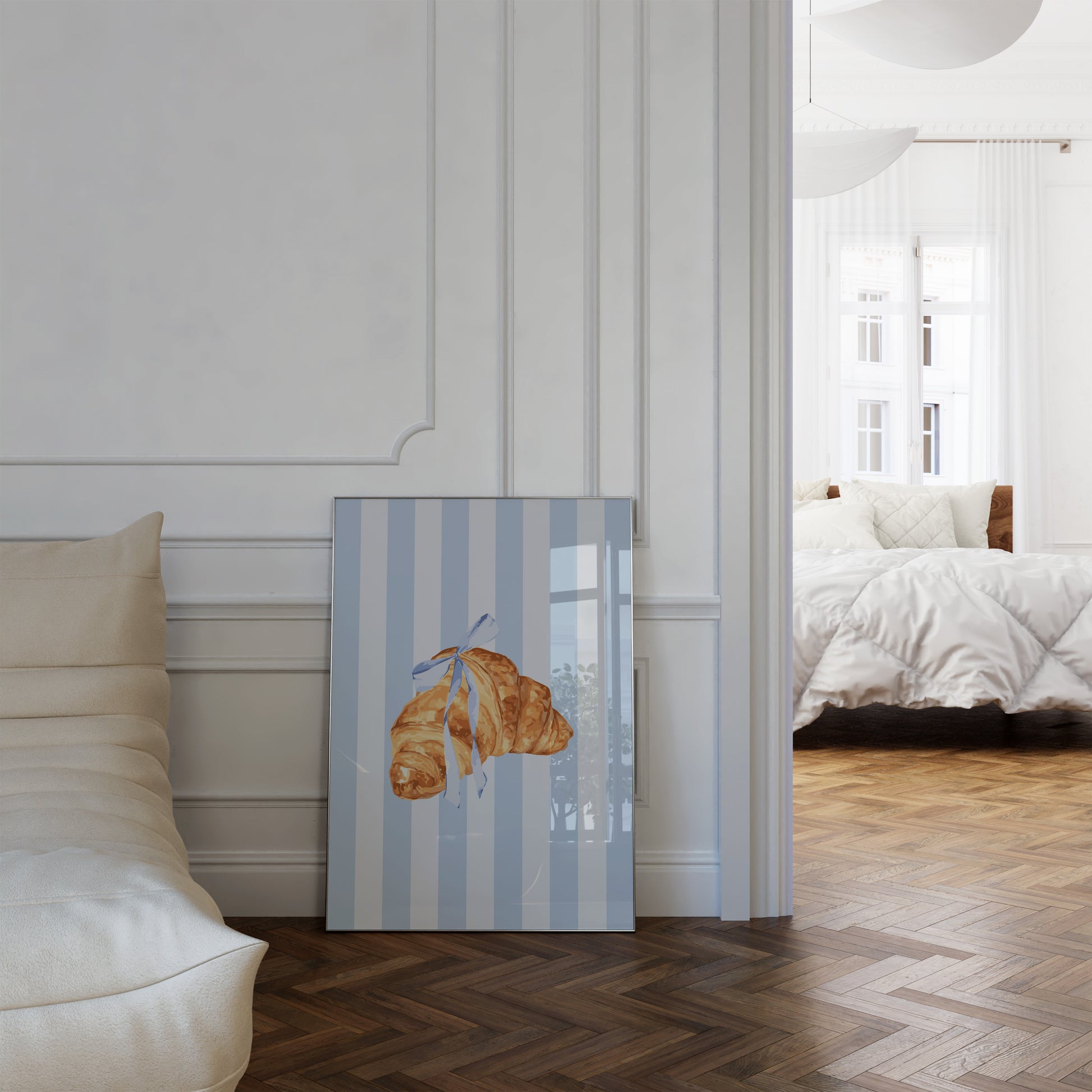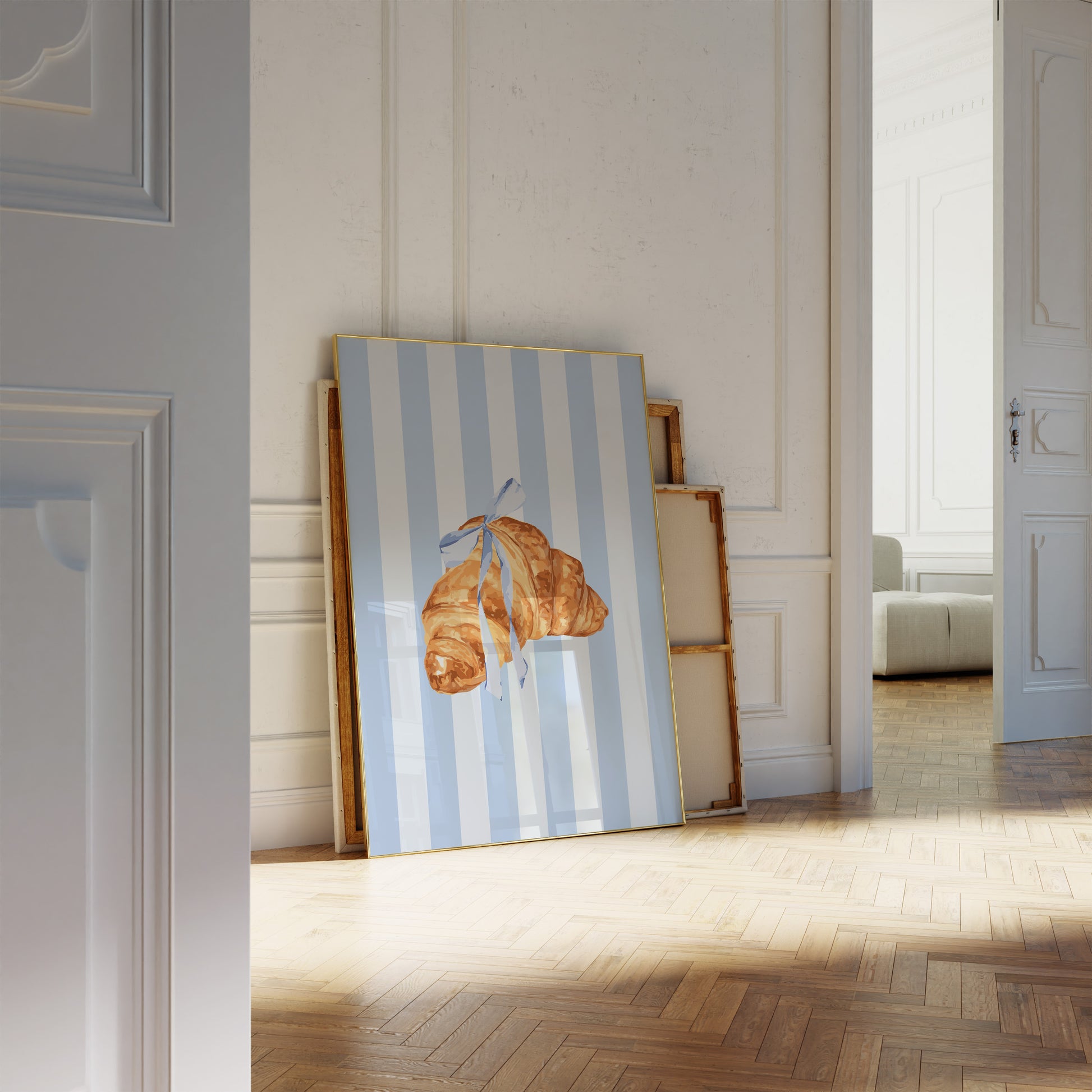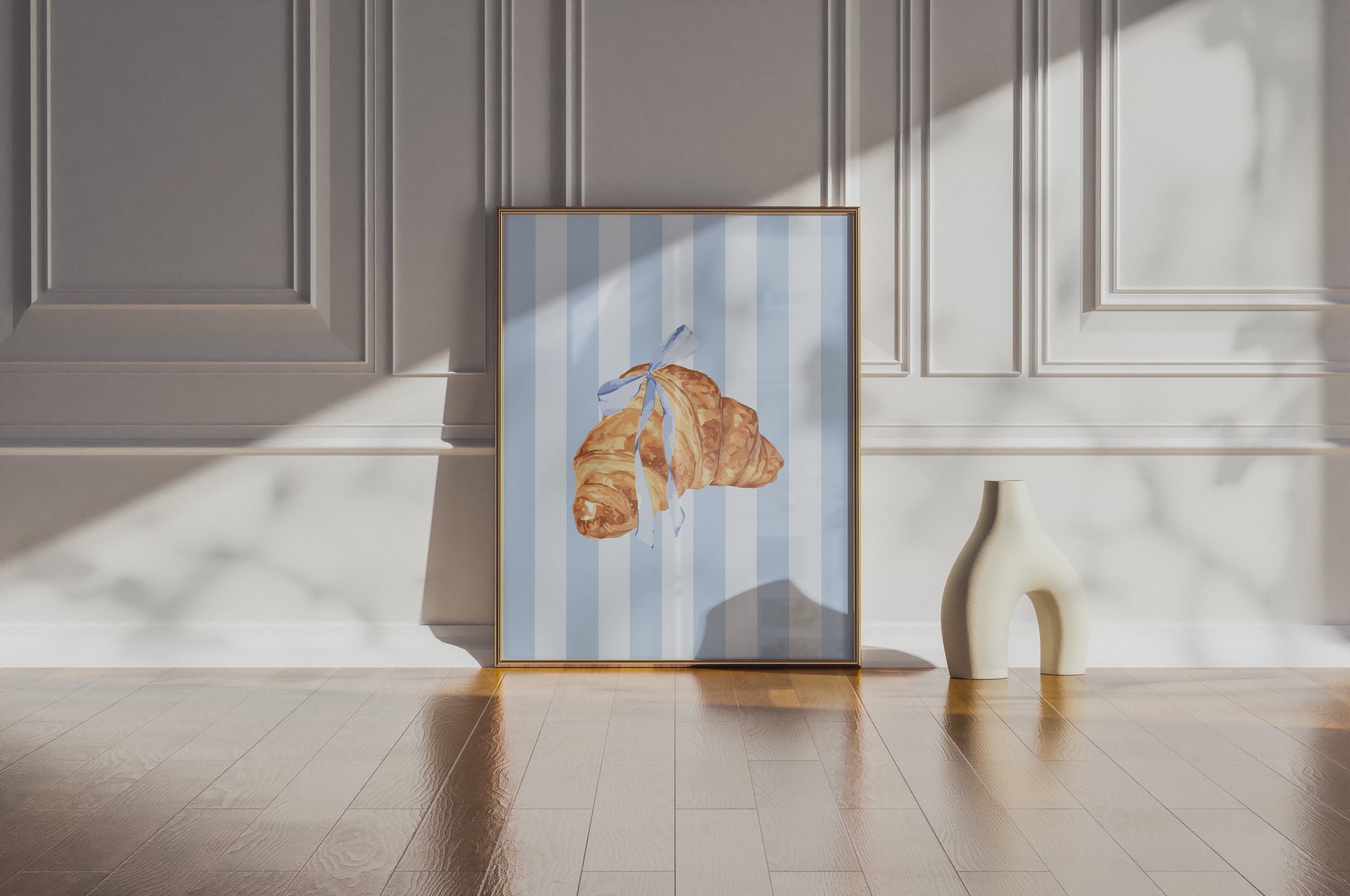 Bring a touch of Parisian charm to your space with this French Croissant Digital Wall Art. Featuring a croissant tied with a soft blue ribbon against a pastel blue striped background, this print combines whimsy with elegance—perfect for kitchen decor, café space decor, bakery decor, or cozy breakfast nook decor.