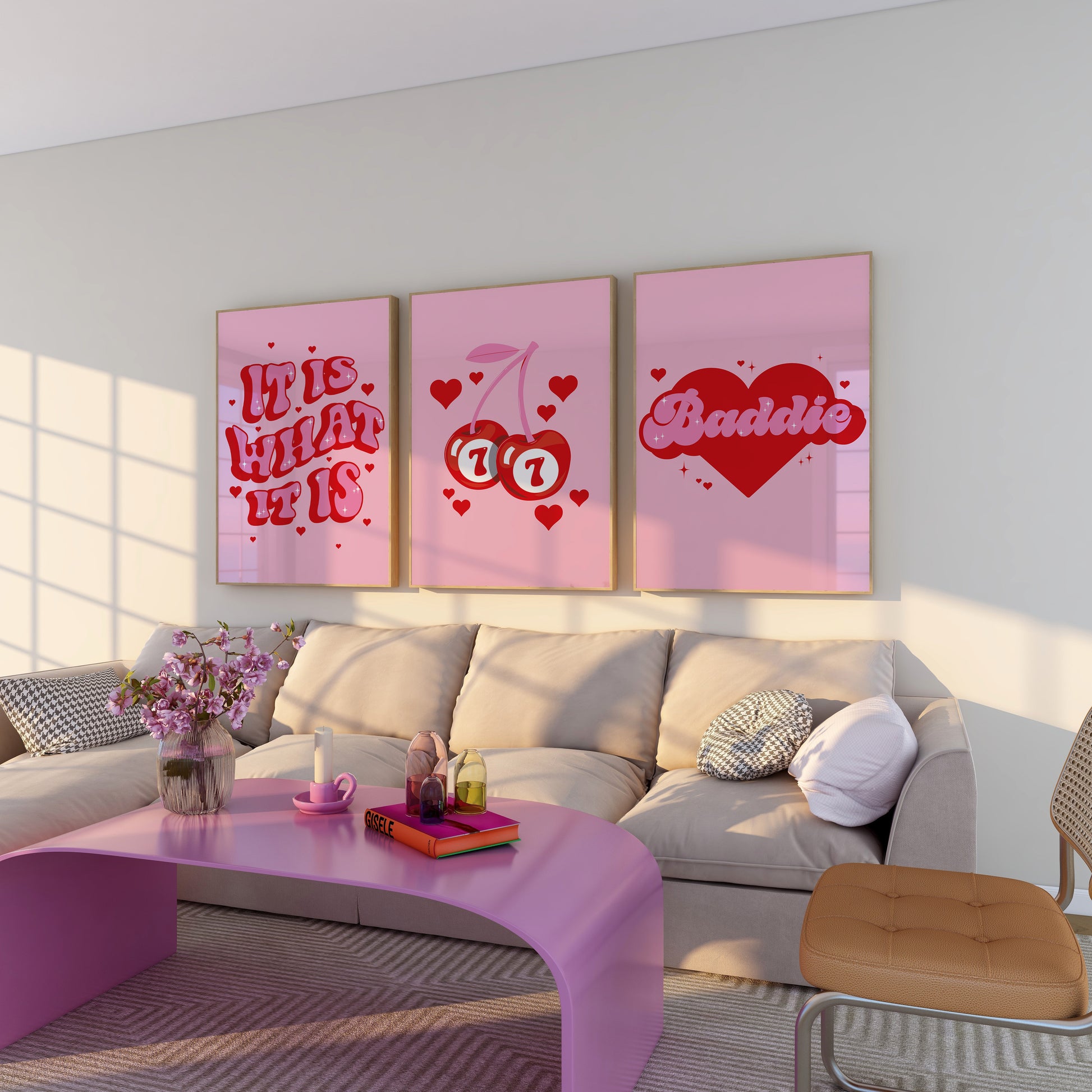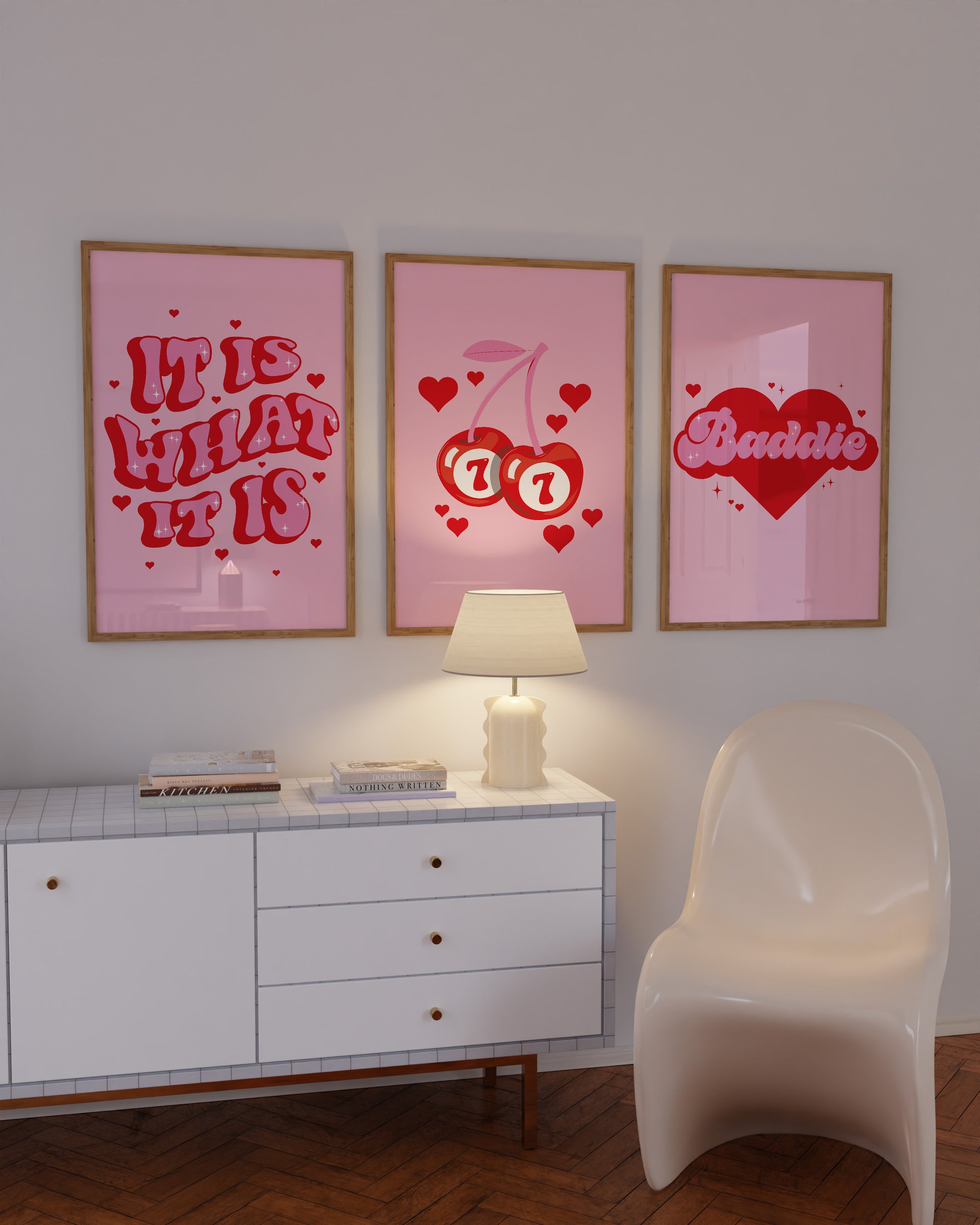 This is the perfect pink and red bedroom decor, pink and red dorm decor, college apartment decor pink and red, it is what it is poster set, cherry wall art, baddie art print. Treat yourself to this cute wall art set to bring all those good vibes into your living space and daily life.
