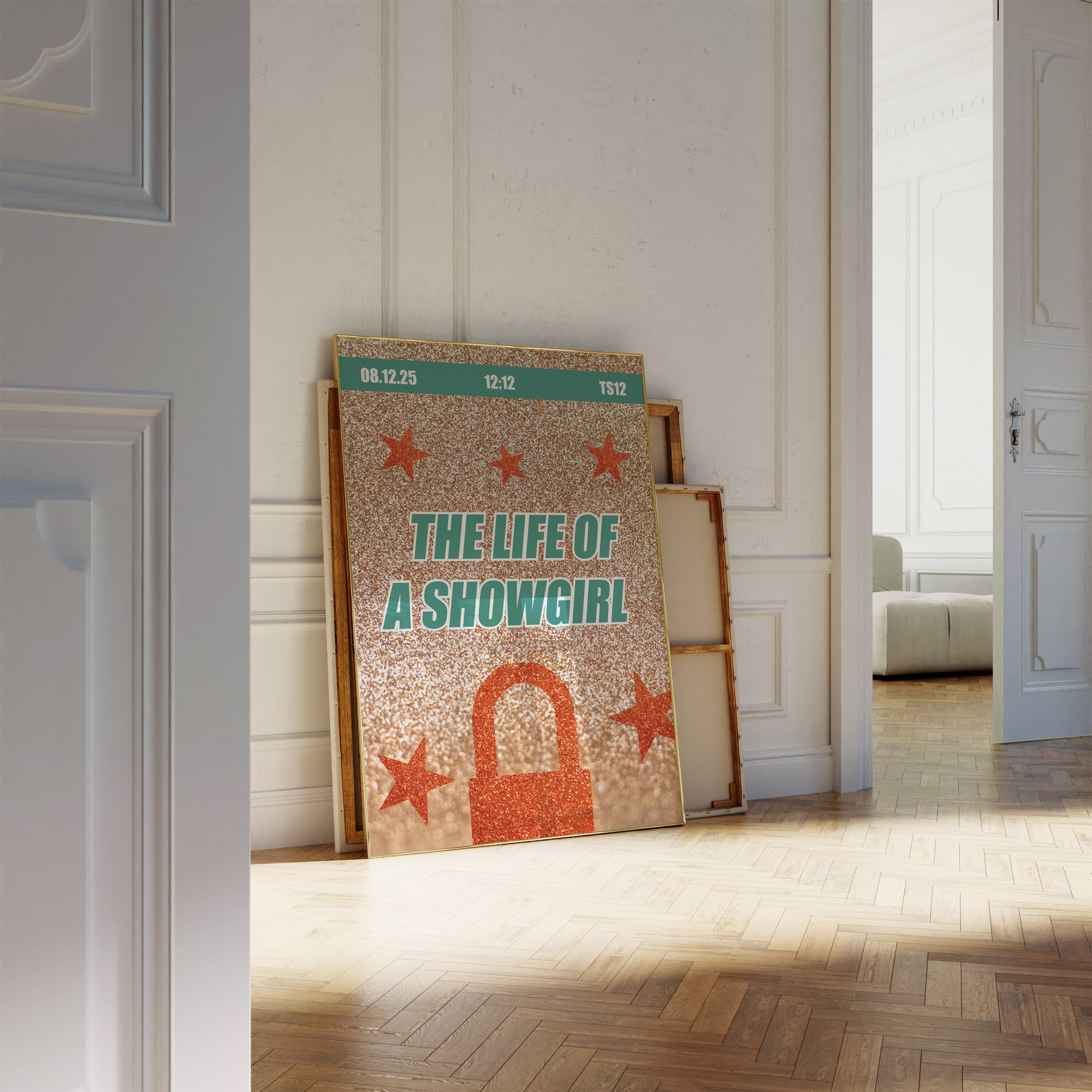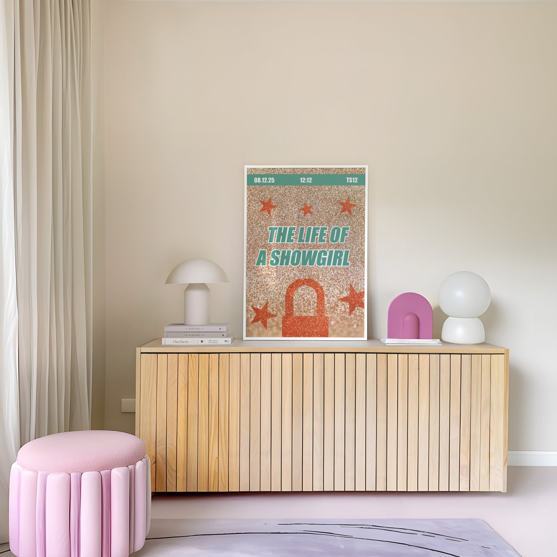 Celebrate the most exciting announcement with this Taylor Swift Poster of the 12th Album titled The Life of a Showgirl, featuring a glitter background and bold typography.