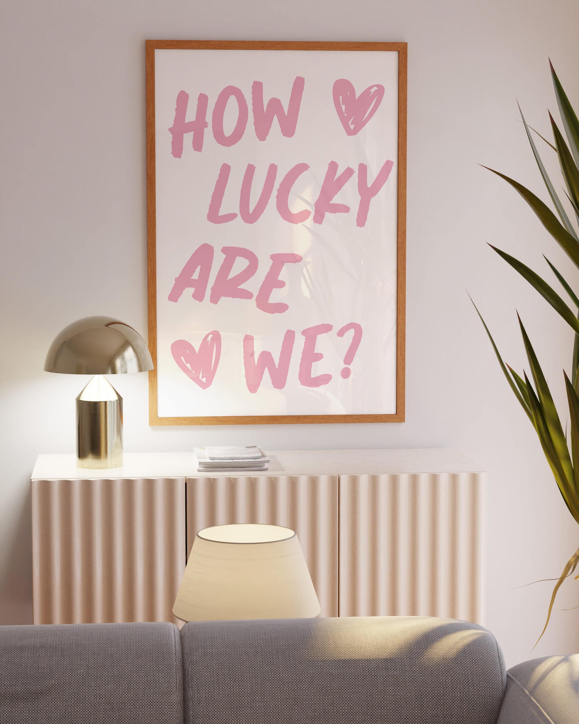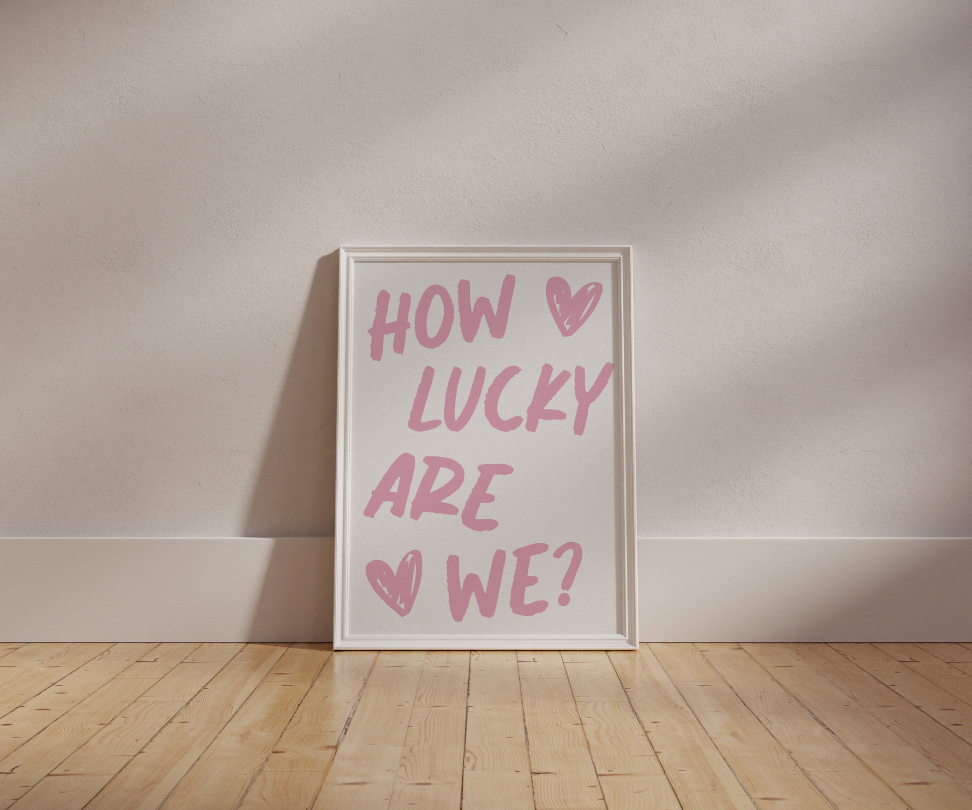 Add a touch of gratitude and charm to your space with this pink digital wall art. Featuring the uplifting quote ‘How Lucky Are We?’, this modern printable is perfect for bedroom decor, living room decor, couples’ space, wellness area, or stylish office. Instantly download and bring warmth and positivity to your home decor today!