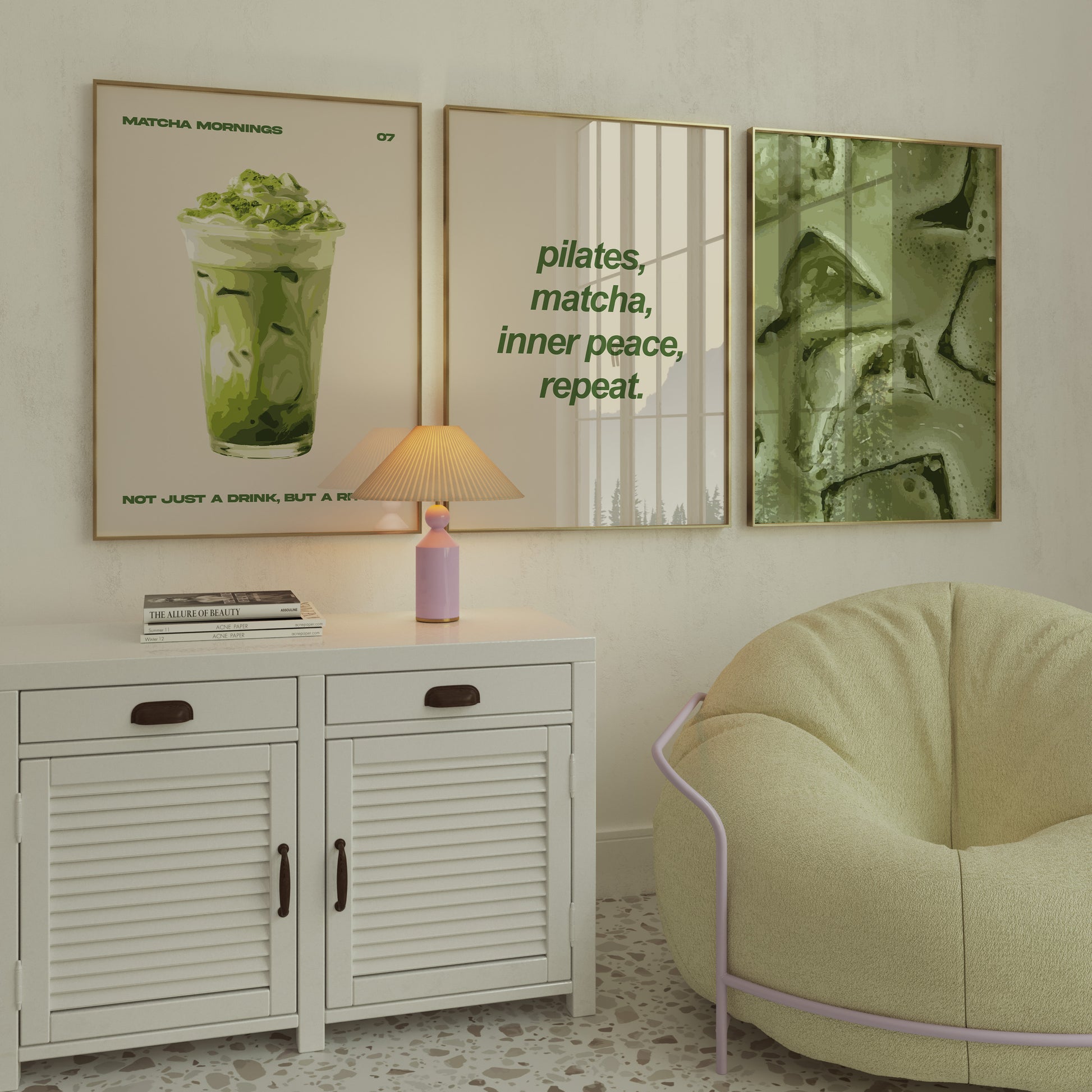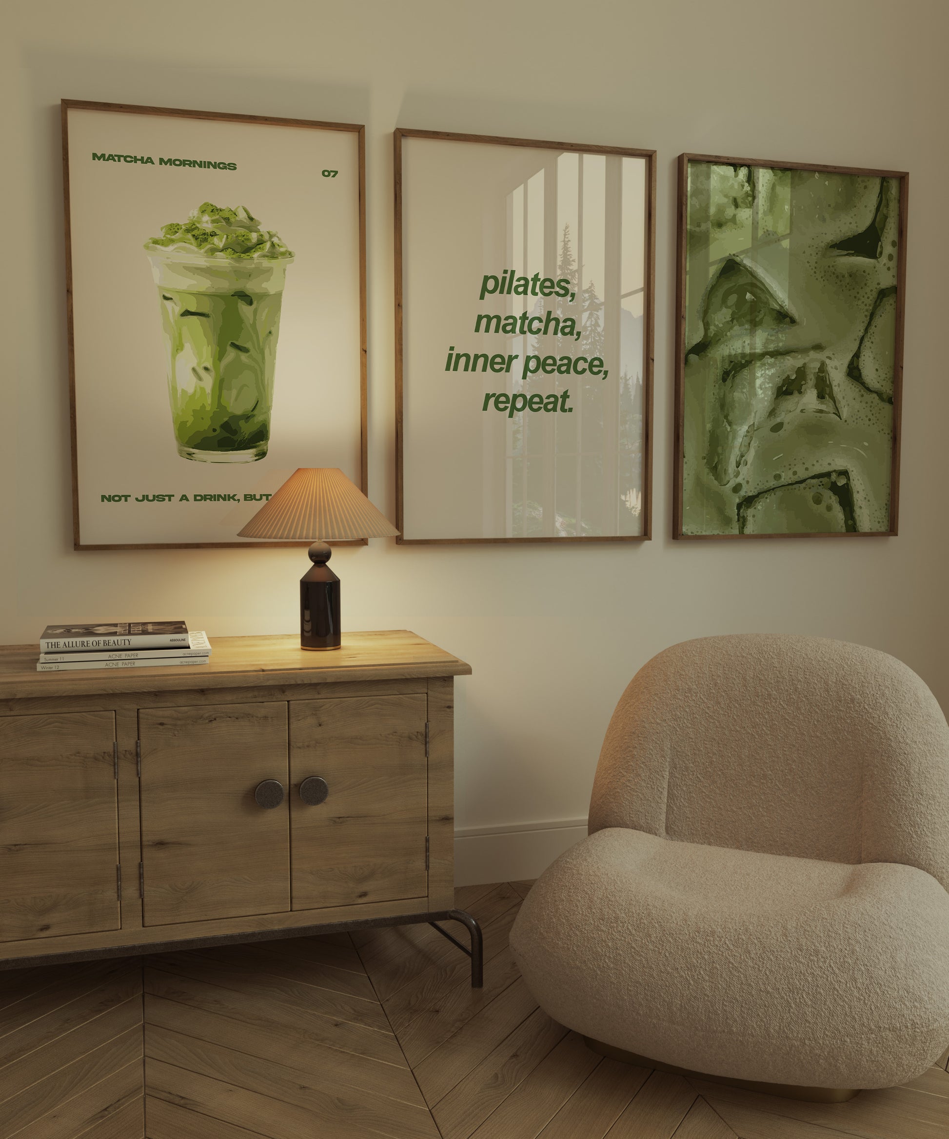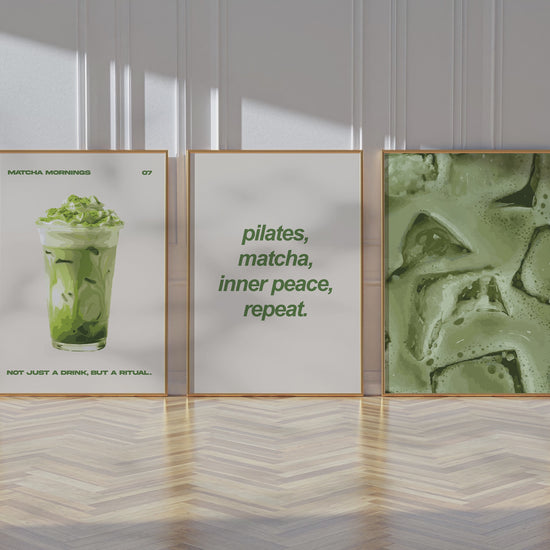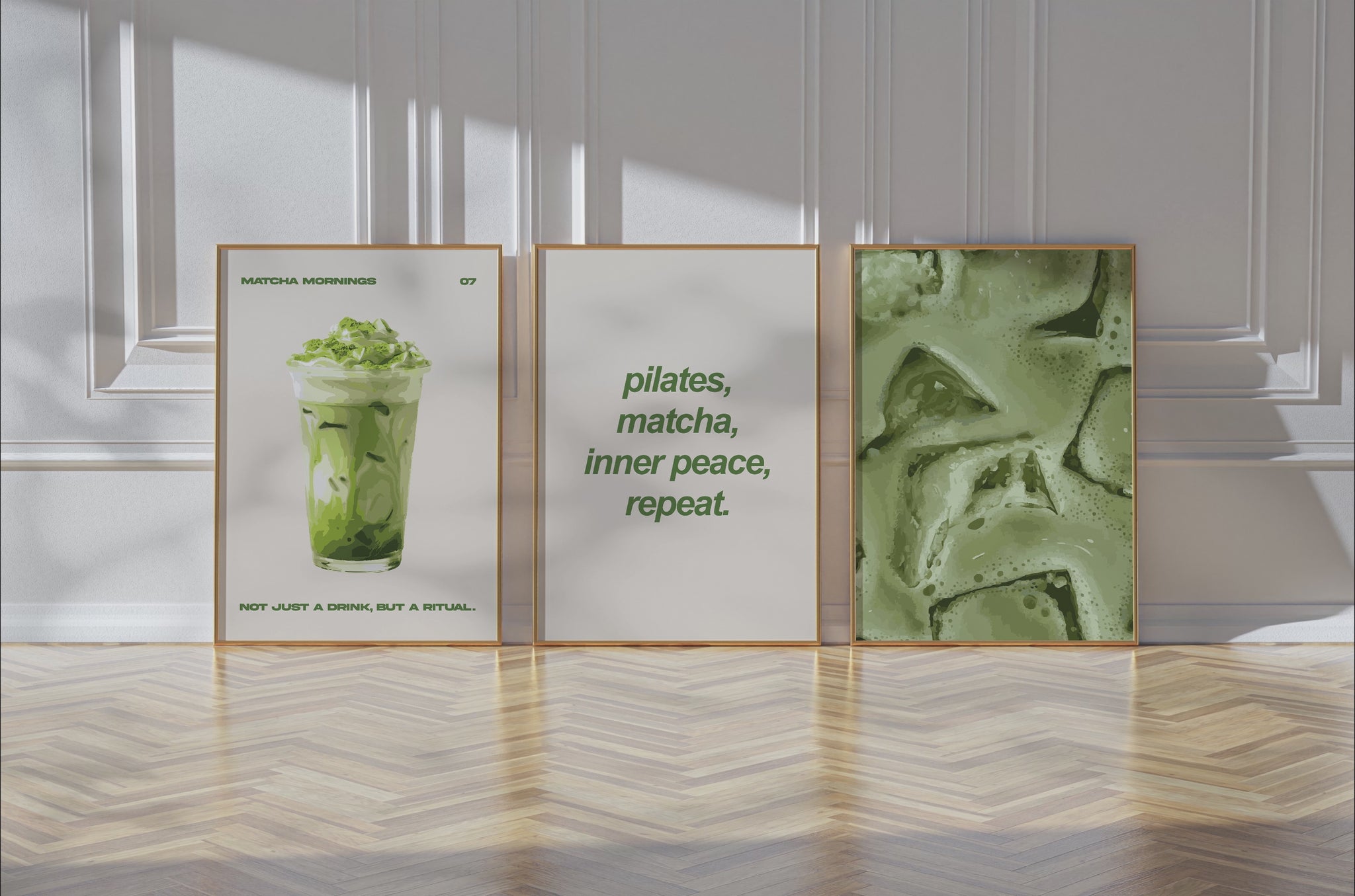 Transform your space with this matcha-themed digital wall art set, perfect for lovers of calm vibes and contemporary interiors. Featuring three coordinated prints, a dreamy matcha latte illustration, a motivational quote ("pilates, matcha, inner peace, repeat."), and a macro shot of iced matcha — this set brings peace, vibrancy, and minimalism to your home, yoga studio, or cafe.