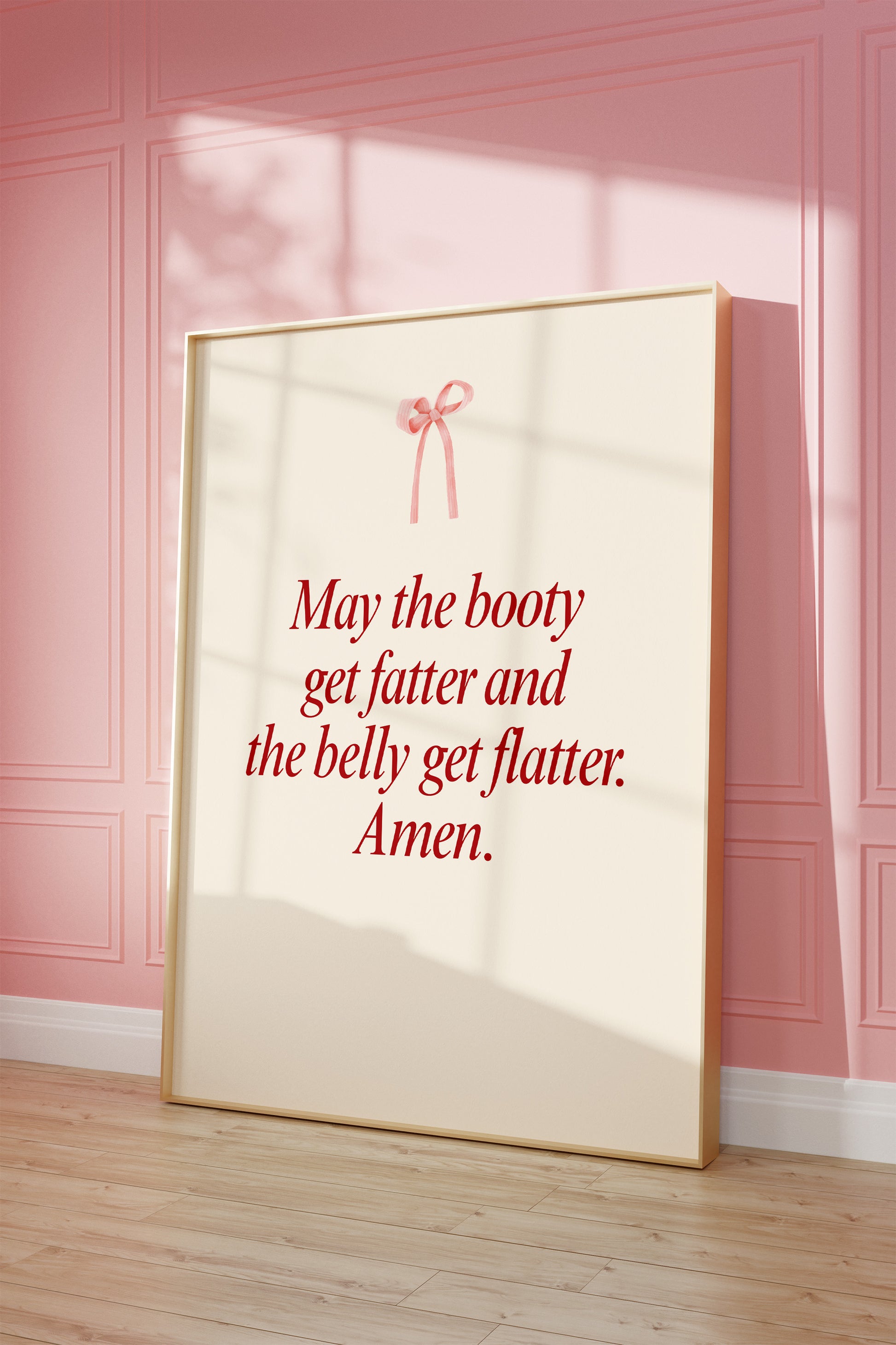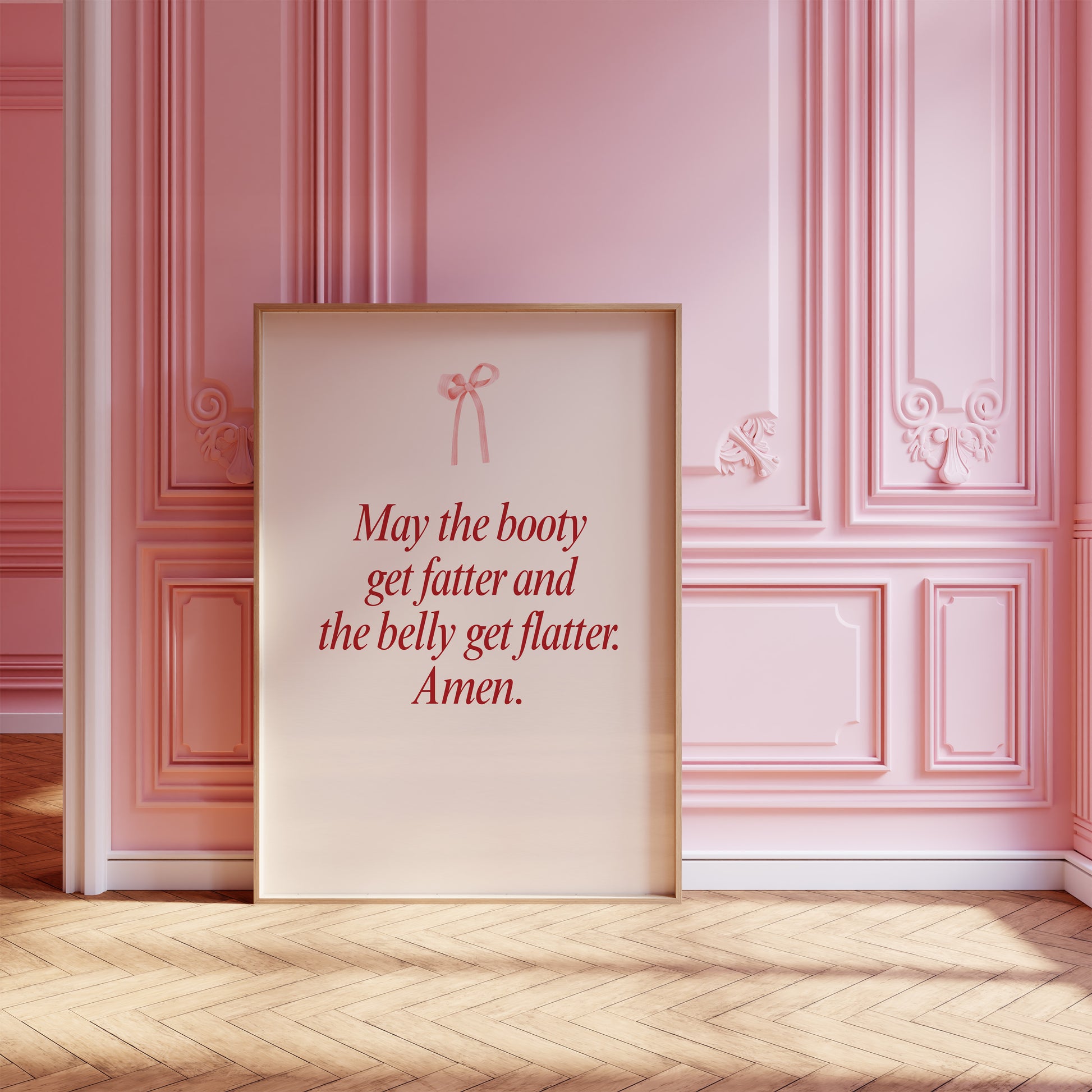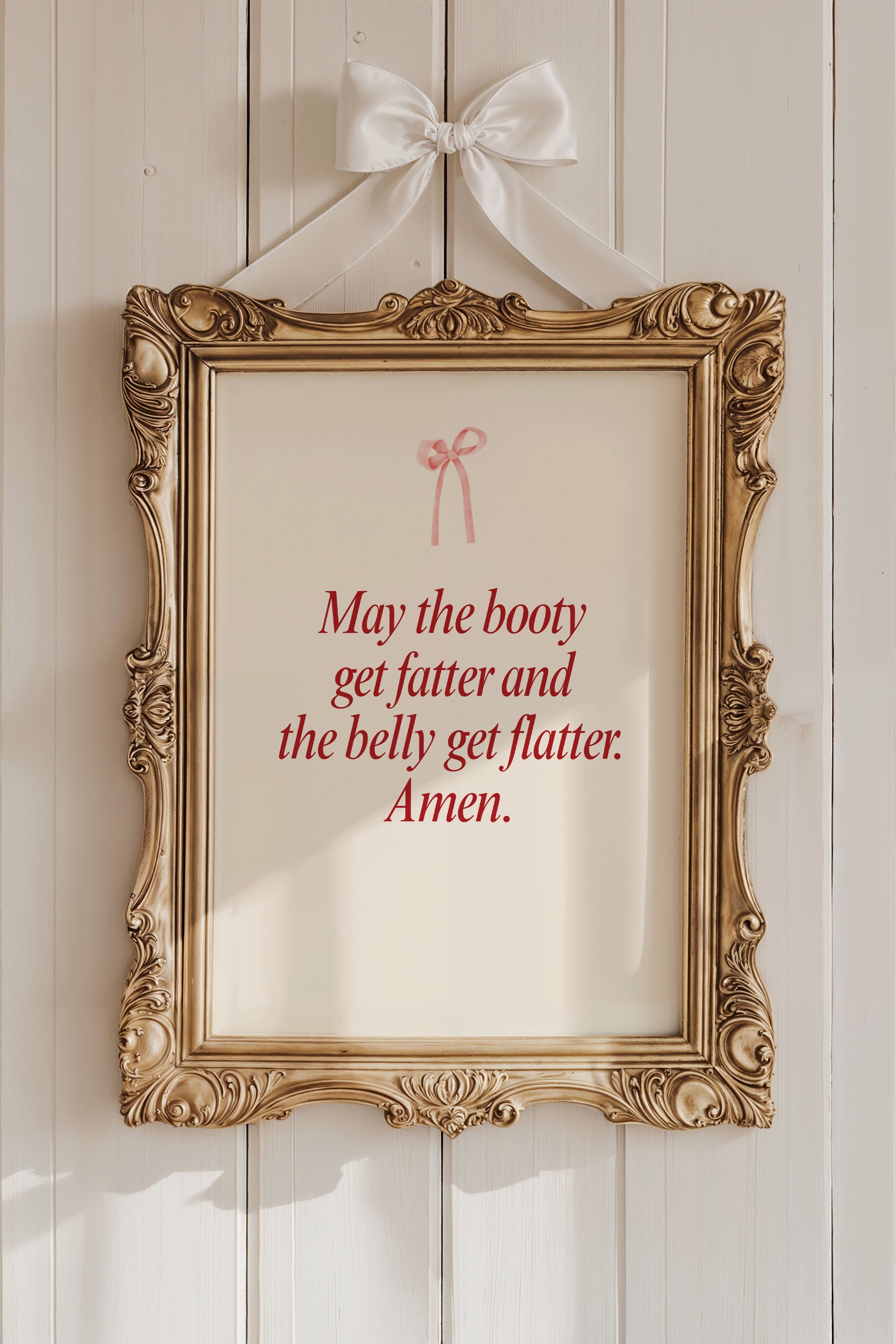 Transform your workout space with this minimalist gym wall art featuring the funny phrase "May the booty get fatter and the belly get flatter. Amen". This elegant print is perfect for creating a minimalist coquette aesthetic in any room, whether it's your fitness space decor, dorm room decor, or your dedicated workout room wall decor.
