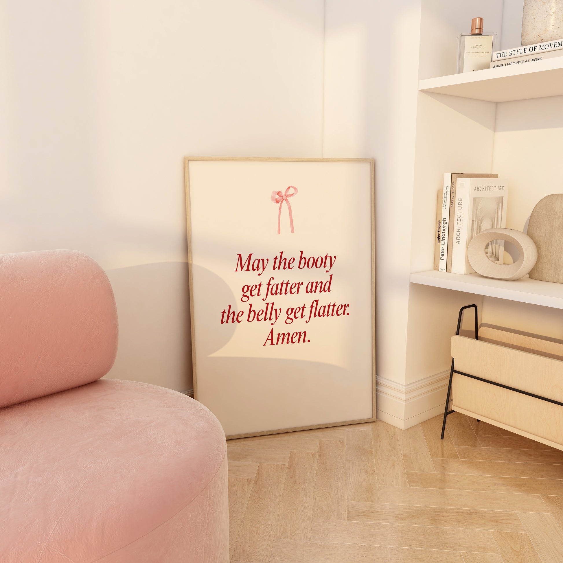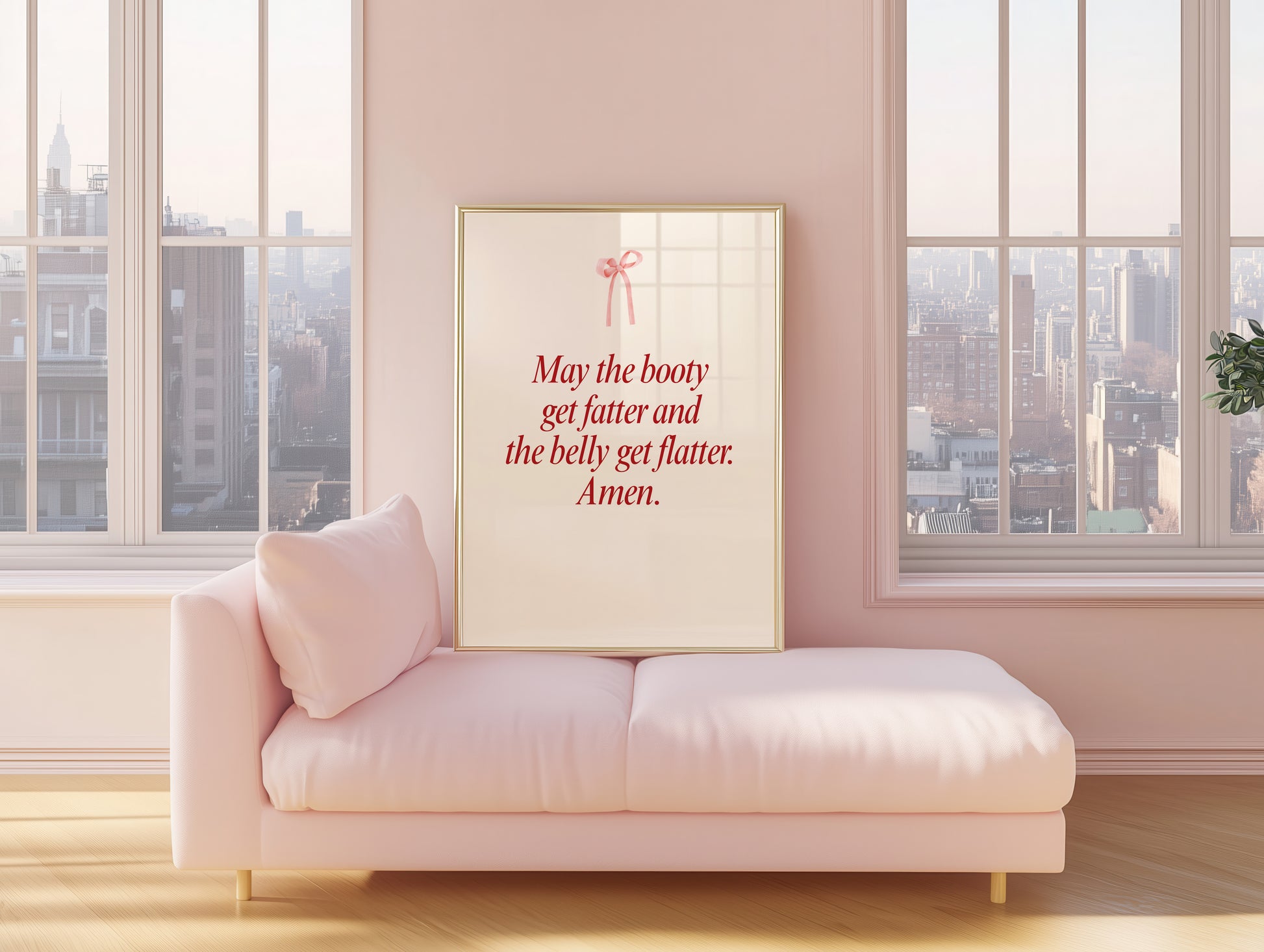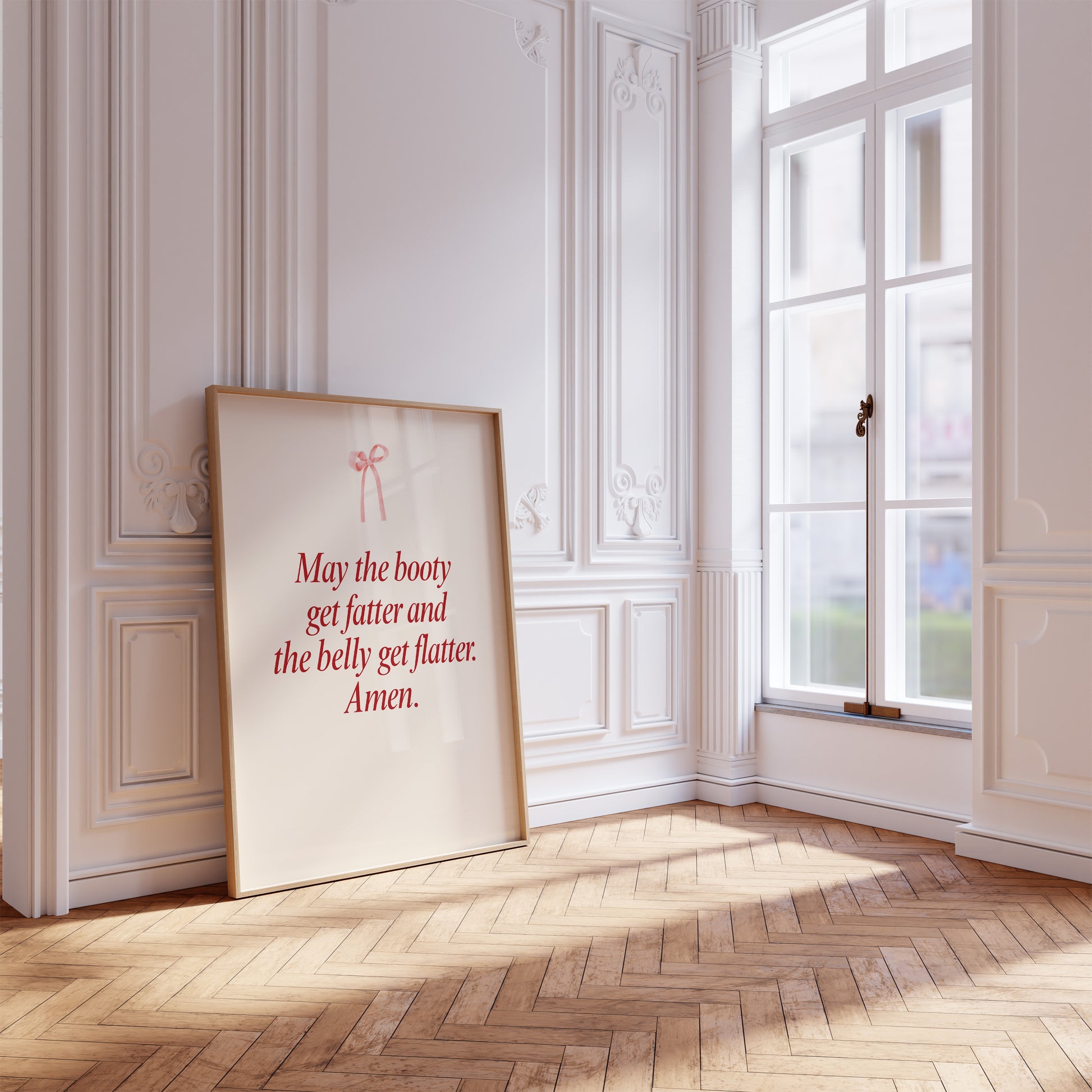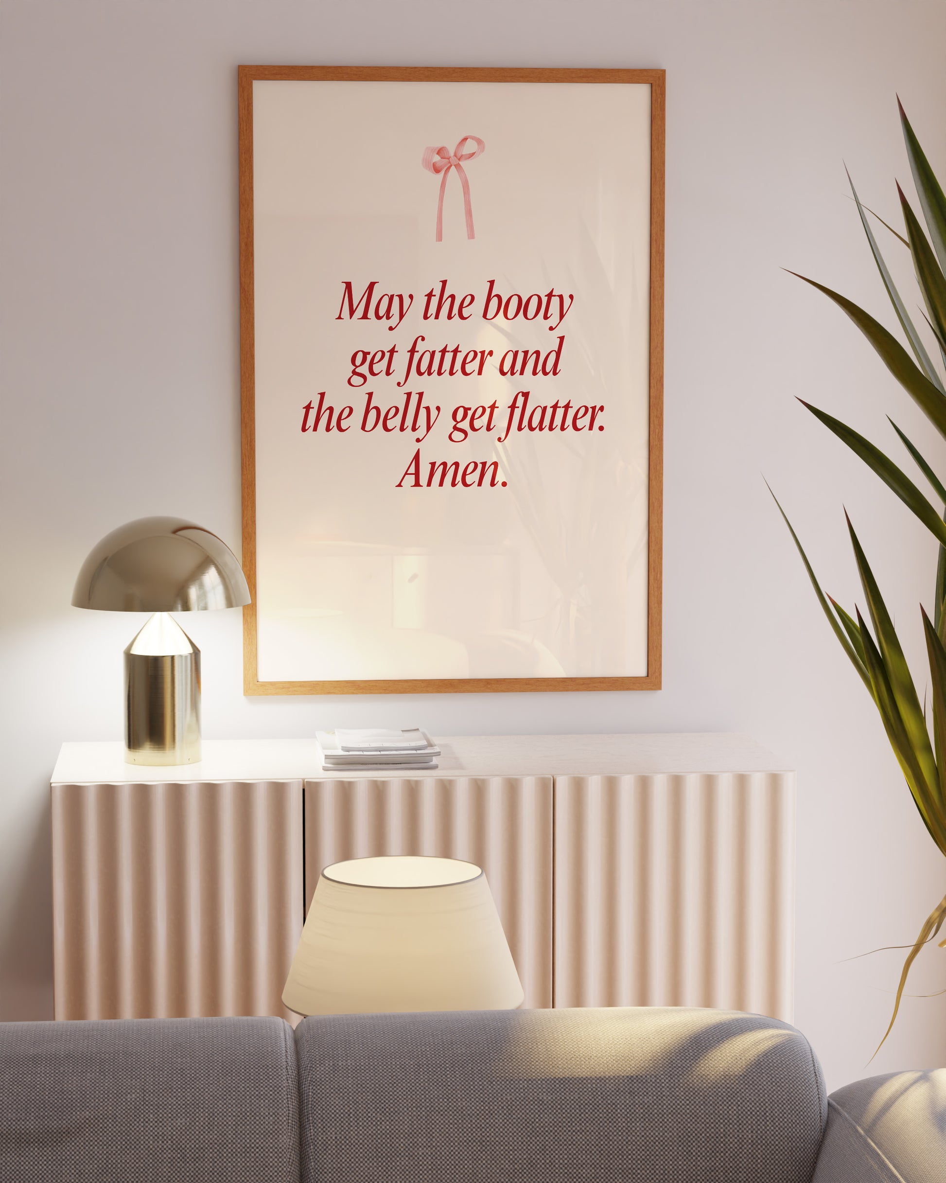 Transform your workout space with this minimalist gym wall art featuring the funny phrase "May the booty get fatter and the belly get flatter. Amen". This elegant print is perfect for creating a minimalist coquette aesthetic in any room, whether it's your fitness space decor, dorm room decor, or your dedicated workout room wall decor.
