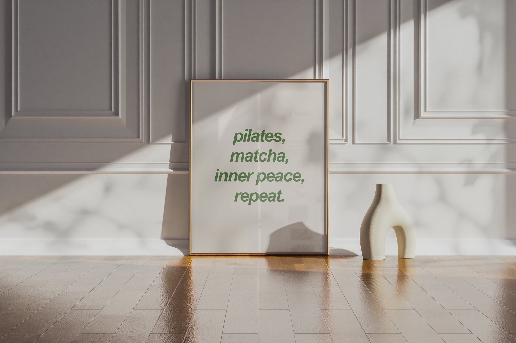 Transform your space with this minimalist digital wall art print that embodies a calm, wellness-focused lifestyle. Featuring the motivational quote "pilates, matcha, inner peace, repeat.", this modern design is perfect for pilates studio decor, home gym decor, or serene living spaces.
