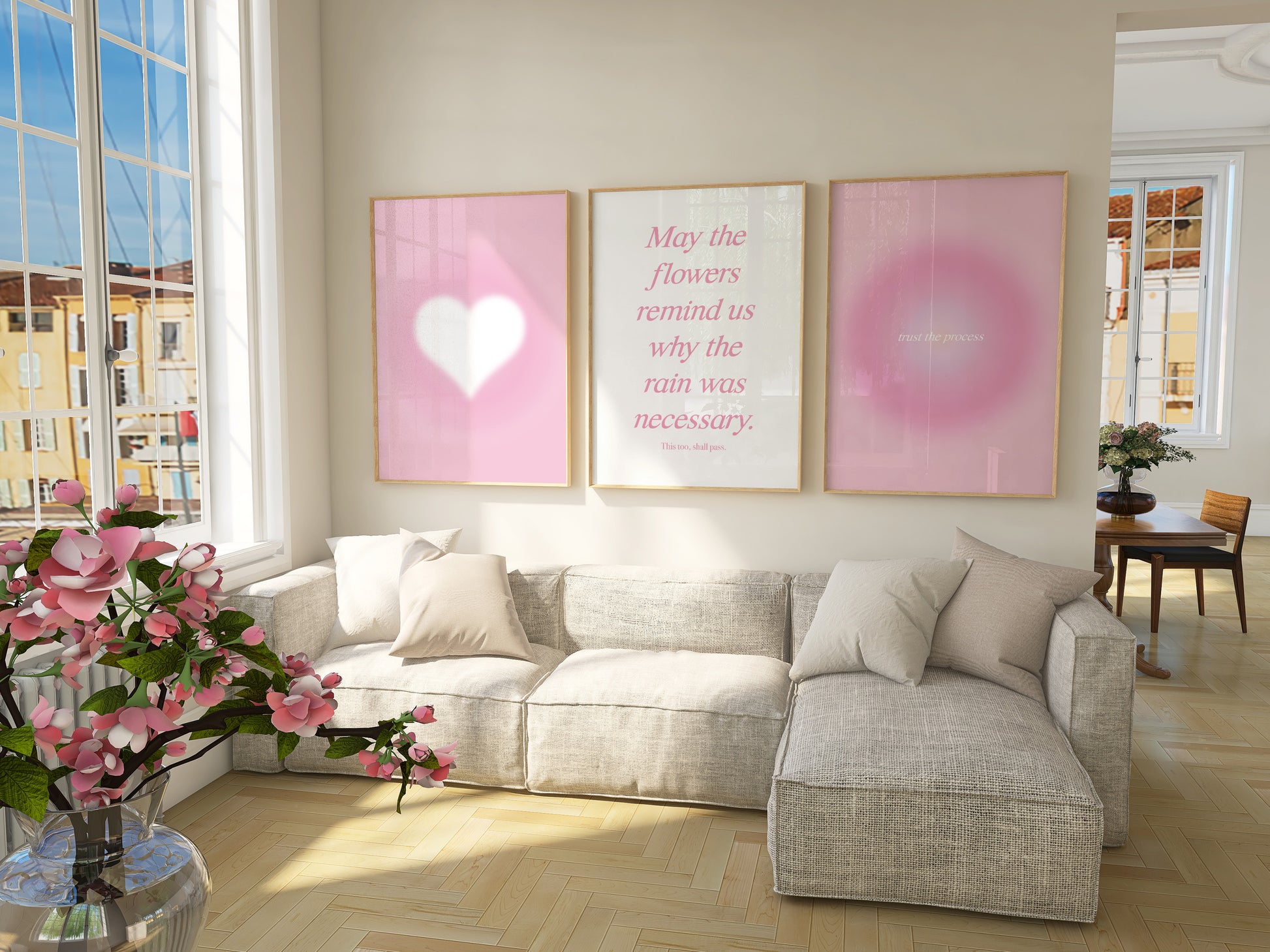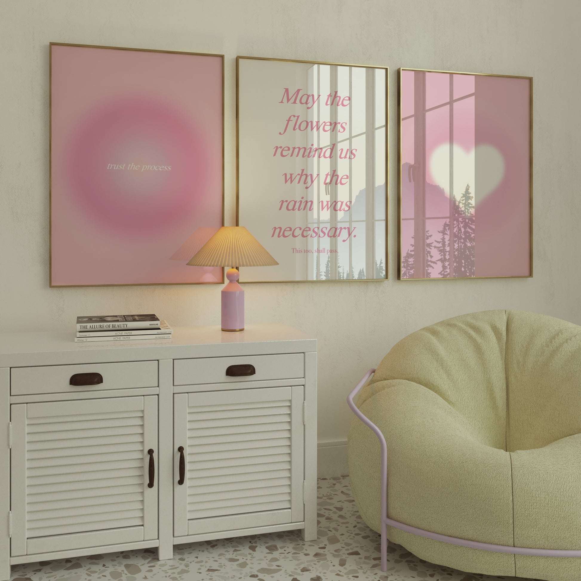 Add a serene touch to your living space with this set of 3 wall art prints, featuring a pink theme, with pink aura and an elegant motivational quote. This digital print is perfect for girl room decor, living room decor, zen home decor, pink theme decor.