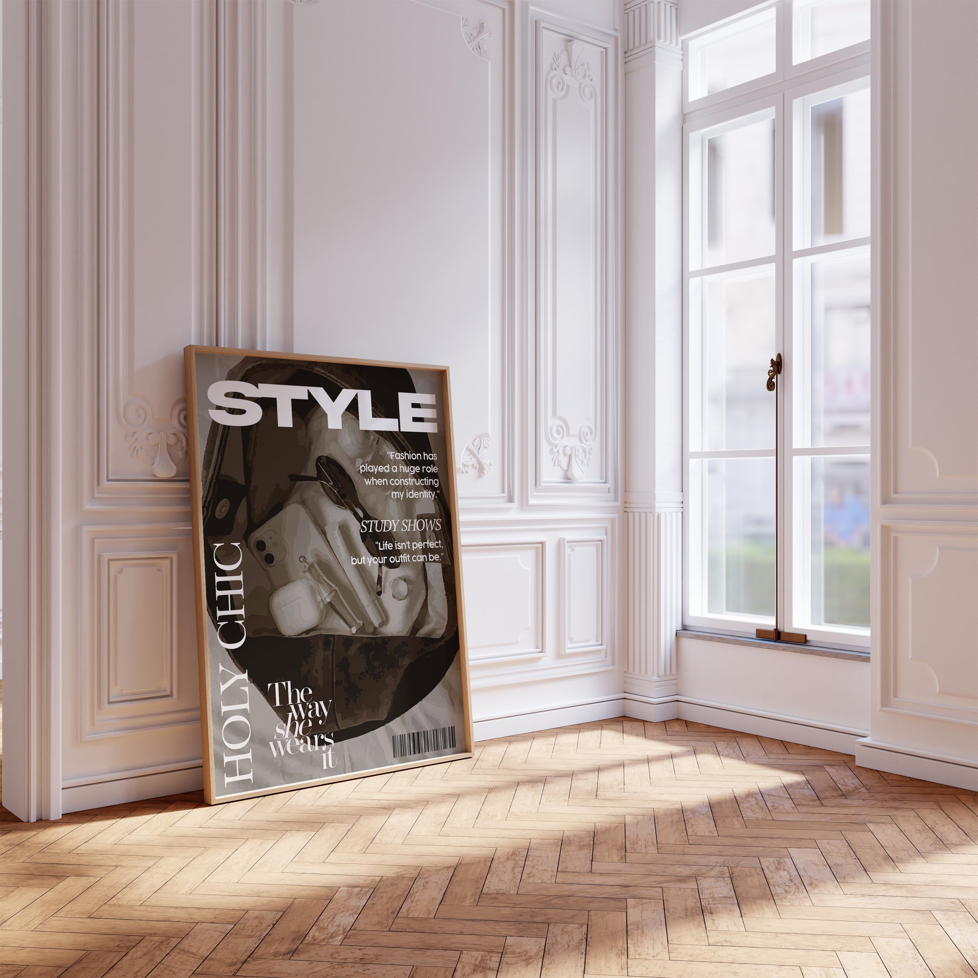 Elevate your space with this sleek, high-fashion inspired STYLE magazine cover wall art. Perfect for bedrooms, dressing rooms, or modern living areas, this print exudes luxury and trend-forward elegance. Featuring bold typography, a neutral palette, and stylish elements like AirPods and iPhone aesthetics, it’s a tribute to fashion’s role in identity.
