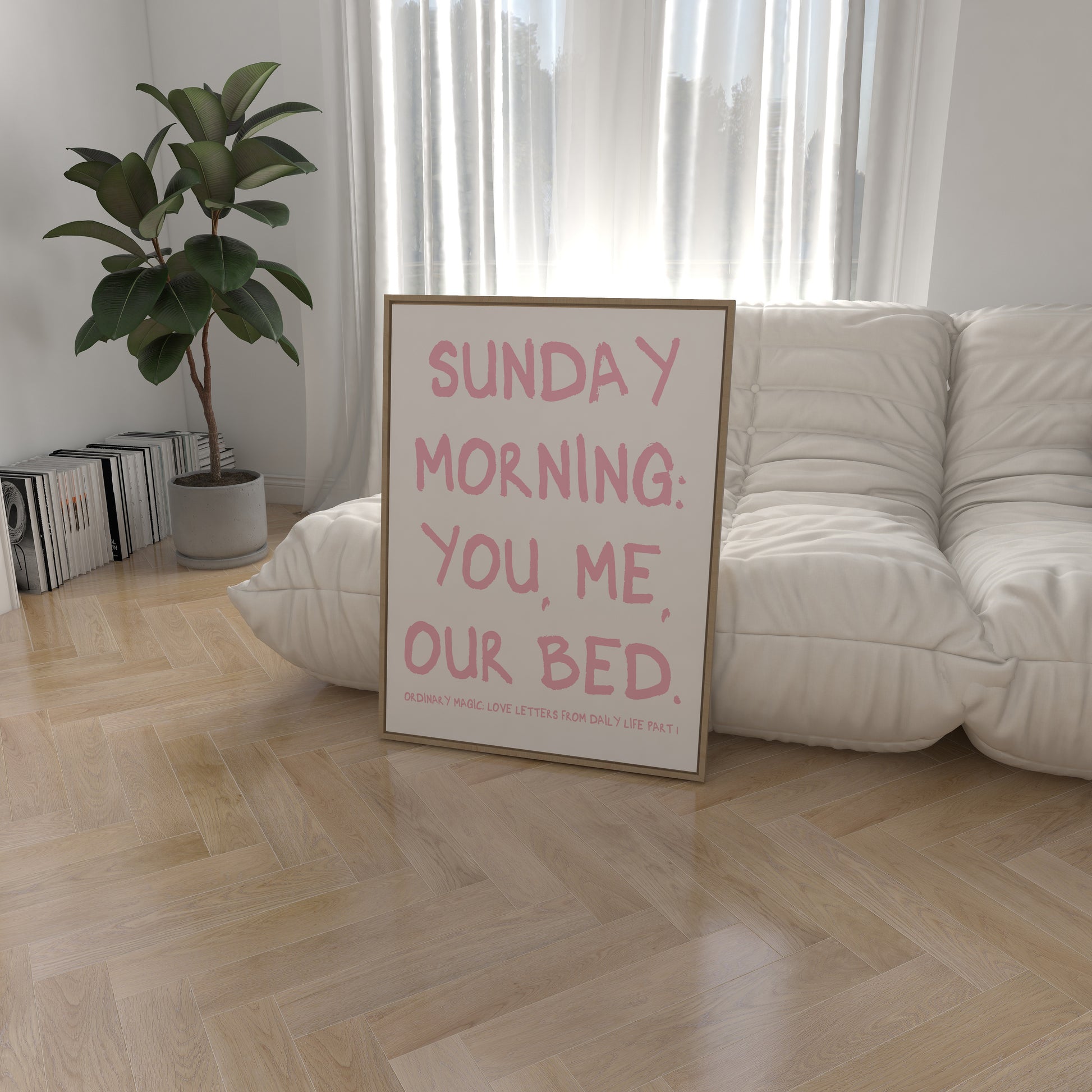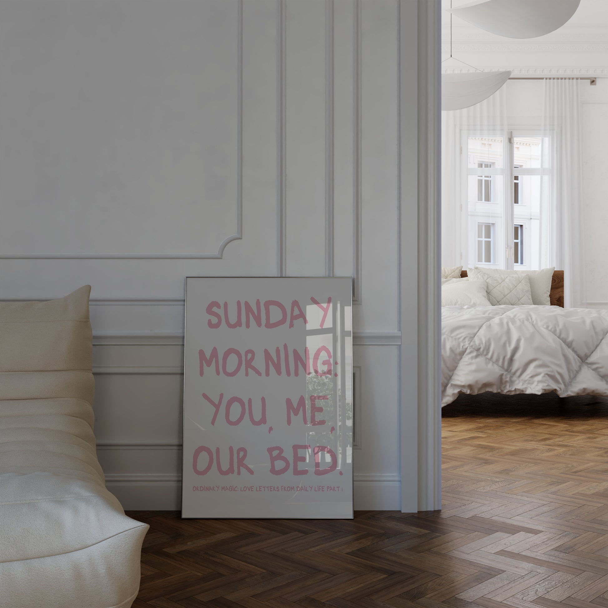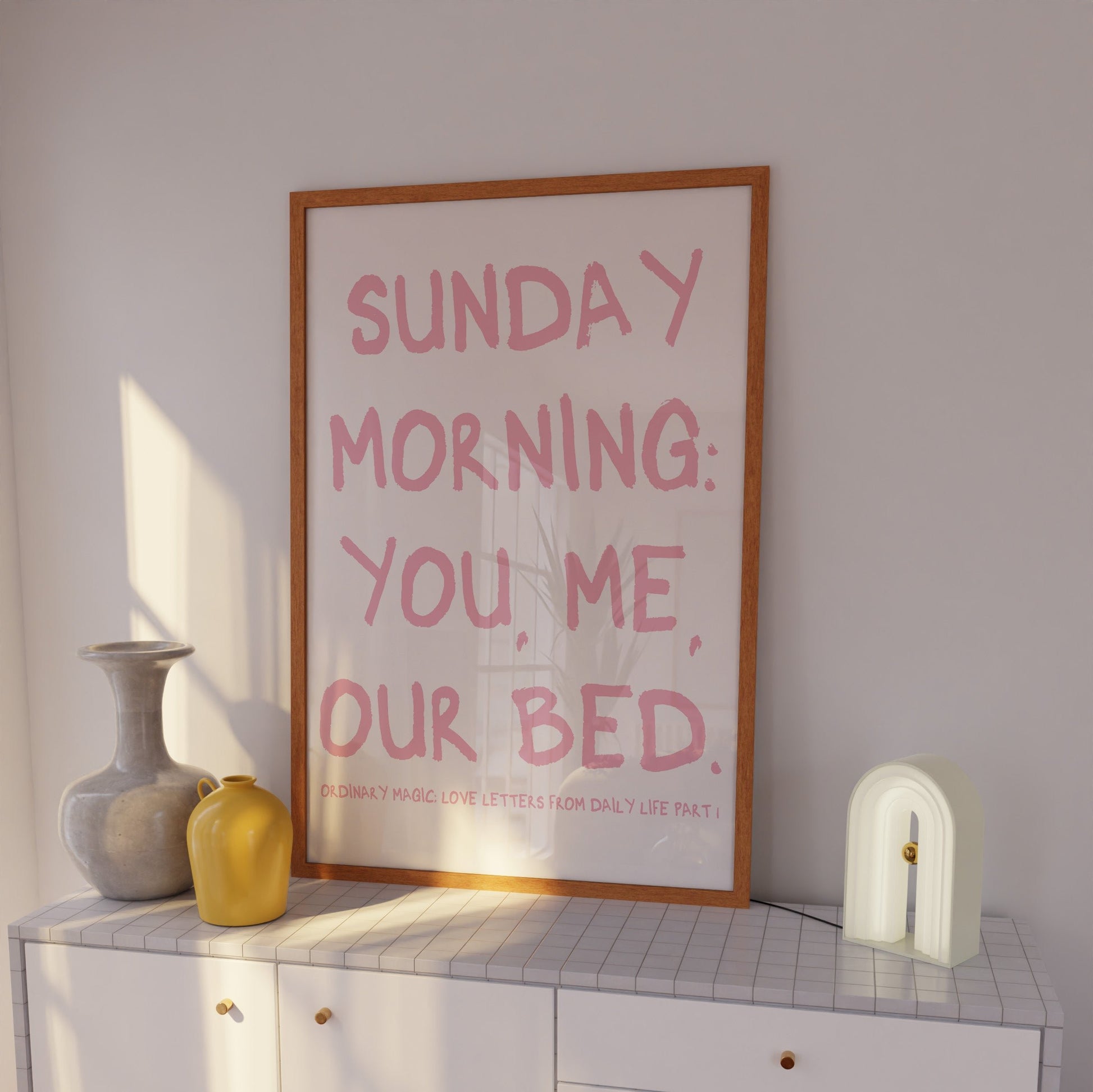 Transform your space into a cozy retreat with this pink wall art digital download, perfect for bedroom decor, couples' space, or self-care retreat. Featuring a romantic Sunday morning quote, this modern print adds a stylish touch to your home decor—ideal for a feminine bedroom or apartment living. Instantly download and elevate your space today!